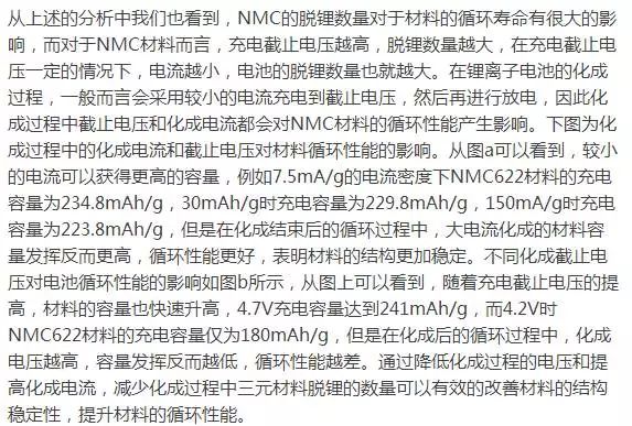 JohannesKasnatscheew对影响三元材料循环性能的因素进行了分析,例如充电截止电压和化成的电压和电流,以及环境温度对NMC和NCA材料循环性能的影响,从本质上来说随着NMC材料脱锂数量的增加,会导致材料的结构稳定性下降,影响循环性能。此外,高温也会对材料的稳定性产生负面的影响,从而导致材料循环性能下降。JohannesKasnatscheew还根据NMC材料的特性,设计了一种全新的充电制度,既截止容量限制,对充电电压进行调整保证电池每次充电的容量都是相同的,从而克服由于电池过电势导致的充电容量和放电容量的衰降,很好的改善了电池的循环性能。
