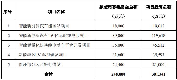 力帆股份5月6日晚间发布非公开发行A股股票预案,拟募集资金总额不超过24.8亿元,用于投资智能新能源汽车能源站、智能新能源汽车16亿瓦时锂电芯、智能轻量化快换纯电动车平台开发等项目,以及偿还银行借款(见下表)。
