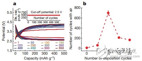 用MoS2阴极、有该保护层的锂阳极,EMIM-BF4/DMSO(25%/75%)混合电解液制成了全电池,并在人工配成的类空气气氛中进行实验。第一周的反应开始发生在2.92V,与Li2O2形成的电势2.96V非常接近,说明了主反应进行良好,在3.75V时达到了500mAh/g的比容量。第一周循环的极化电压差为0.88V,50周后为1.3V,550周后为1.62V。而在反应达到700周后,电池依然可以工作;与此形成对比的是,不经保护的锂空气电池只能循环10次左右就已经失效。对于保护层的厚度选择,该文作者认为:太薄的保护层会导致电解液分解,厚的保护层又会导致大的电荷转移电势以及副反应,因此需要优化。经实验,发现10次循环制备的保护层厚度最为合适。