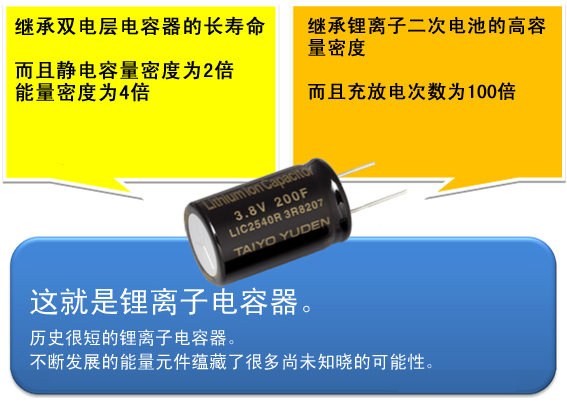 锂离子电容器是一种混合电容器,同时具有两个长处,那就是:可以反复充放电的双电层电容器的“长寿命”和锂离子二次电池的“高容量密度”。这种离子电容器采用在负极上预先掺杂锂离子的技术,可在3.8V的低电压下使用。另外,它不含会污染环境的重金属,是一种环保电容器。